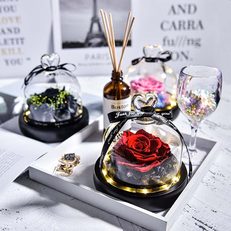 Natural Eternal Flowers Beauty and Beast Forever Preserved Rose In Glass Dome with Led Valentine Wedding Christmas Gifts for Her
